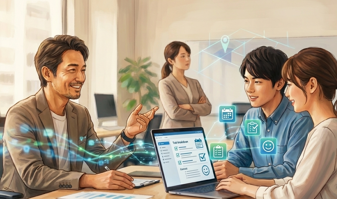 慣れない仕事や新人の場合は、朝・昼・夕の3回報告をもらうか、こちらから声をかけます。これは監視ではなく、迷子にさせないための伴走です。